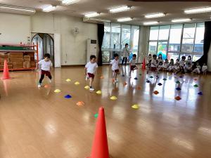 - 体操、動物の動き、走り方、コーンを使ってみよう