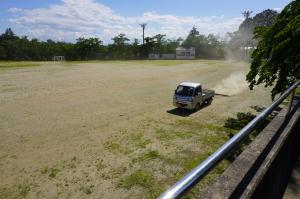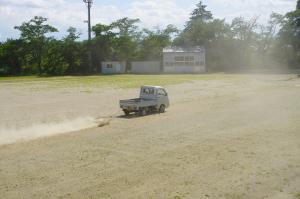 - 軽トラックにレイキを着けて校庭を走り、除草作業、校庭整地を行った。